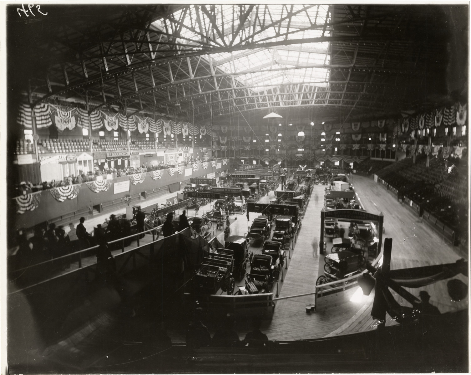 View of cars on exhibit during the 1900 New York Auto Show held at Madison Square Garden in New York. Stamped on back: "Photographic illustration by Nick Lazarnick, 230 Park Ave., N.Y." Handwritten on back: "First auto show, Mad. Sq. Garden, N.Y., Nov. 1900. Shows--New York, 1900."