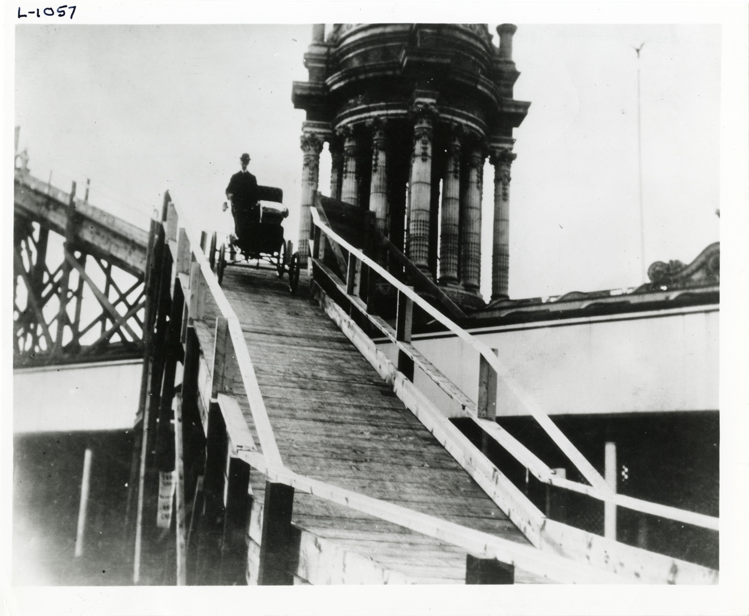 View of Joseph H. McDuffee of Prest-O-Lite, driving a Locomobile car on rooftop ramp during the 1900 New York Auto Show held at Madison Square Garden in New York. Typed on back: "Joseph H. McDuffee, late of Prest-O-Lite driving a Locomobile steamer down the runway for steam cars at the first automobile show at Madison Square Garden." Handwritten on back: "Shows--New York, 1900."