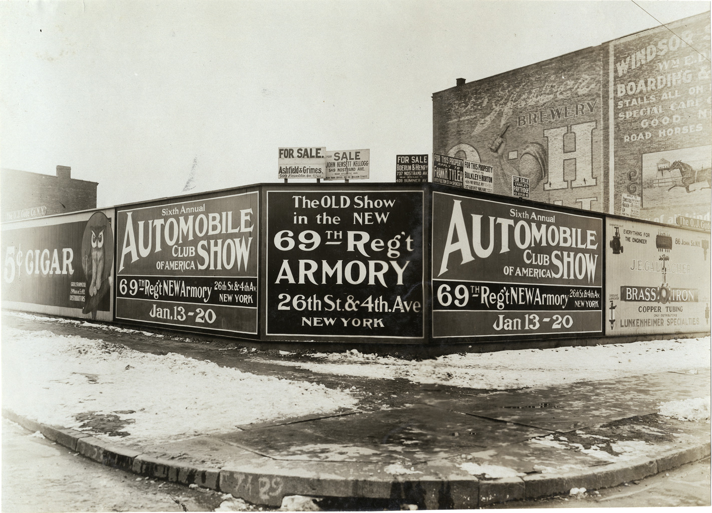 Close-up view of billboards on fence advertising the the 1906 New York Auto Show held at the 69th Regiment Armory in New York. Signs read: "Sixth Annual Automobile Club of America Show, 69th Reg't new Armory, 26th St. & 4th Ave., New York, Jan. 13-20" and "The old show in the new 69th Reg't Armory, 26th St. & 4th Ave., New York." Brick wall signs on buildings in background. Stamped on back: "Photo by F. Ed. Spooner, 1536 B'way, telephone 6536-38th St., New York, N.Y." Handwritten on back: "Shows--New York, 1906."