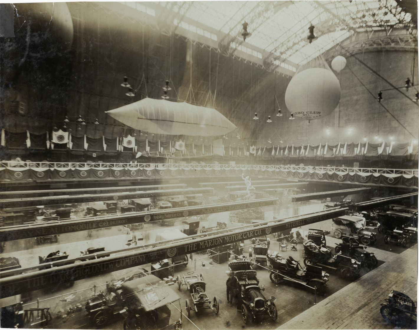 Automobiles, hot air balloon and blimp on exhibit, 1906 New York Auto Show