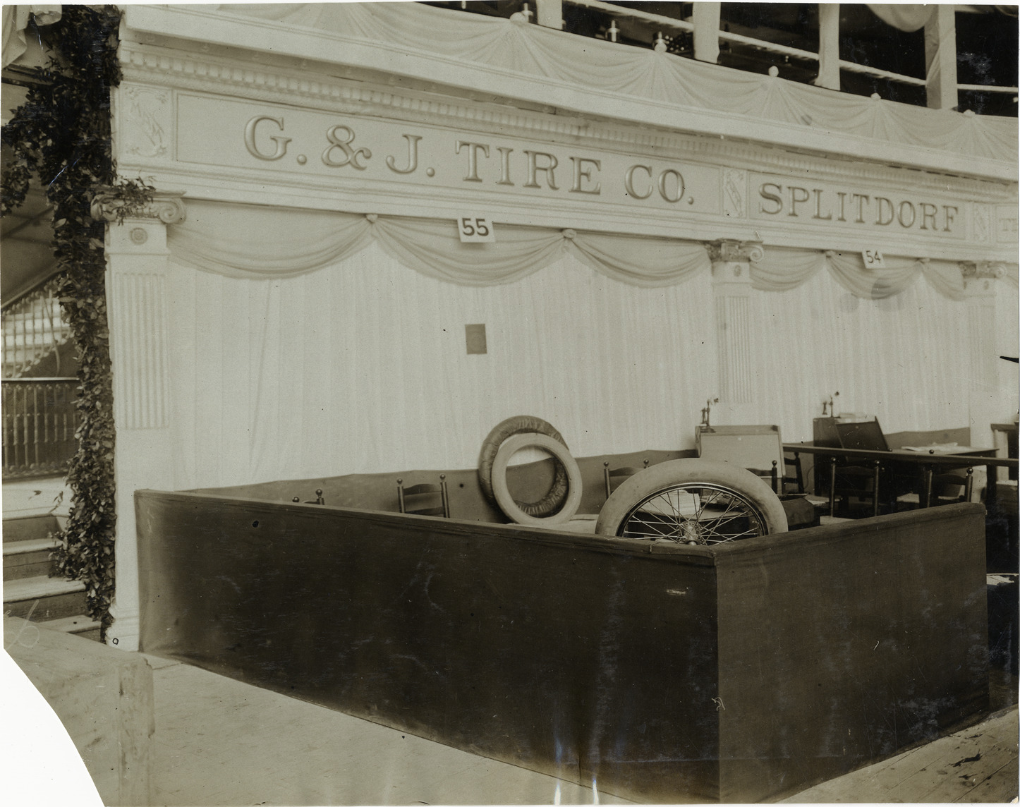 View of G & J Tire Company exhibit of tires during the 1906 New York Auto Show held at the 69th Regiment Armory in New York. "G & J Tire Co." and "Splitdorf" signs in background. Stamped on back: "Photo by F. Ed. Spooner, 1536 B'way, telephone 6536-38th St., New York, N.Y." Handwritten on back: "Shows--New York, 1906."