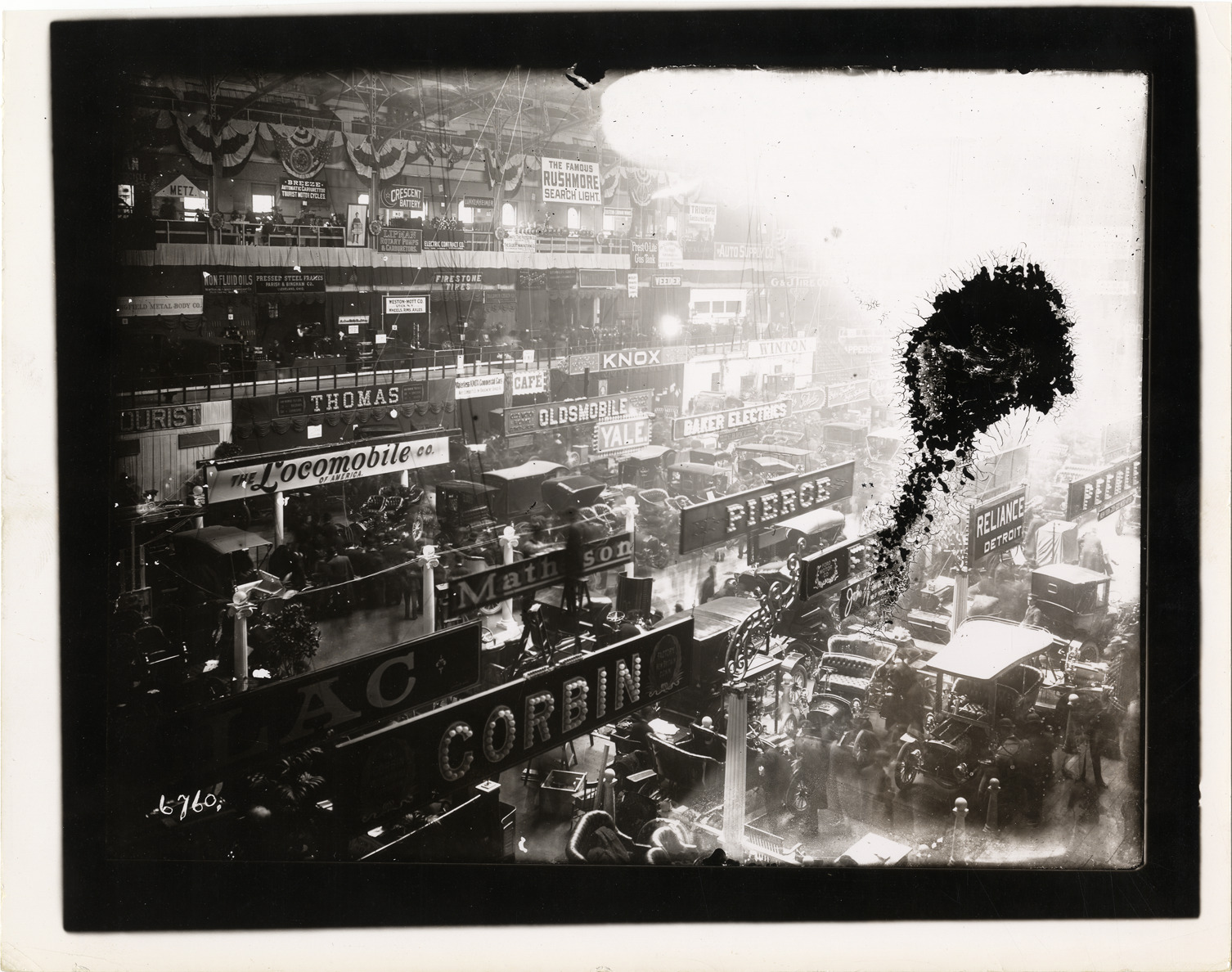 View of exhibit area during the 1905 New York Auto Show held at Madison Square Garden. Stamped on back: "Photographic illustration by Nick Lazarnick, 230 Park Ave., N.Y." Handwritten on back: "National Auto Show, N.Y., Madison Sq. Garden. Shows--New York, 1905."