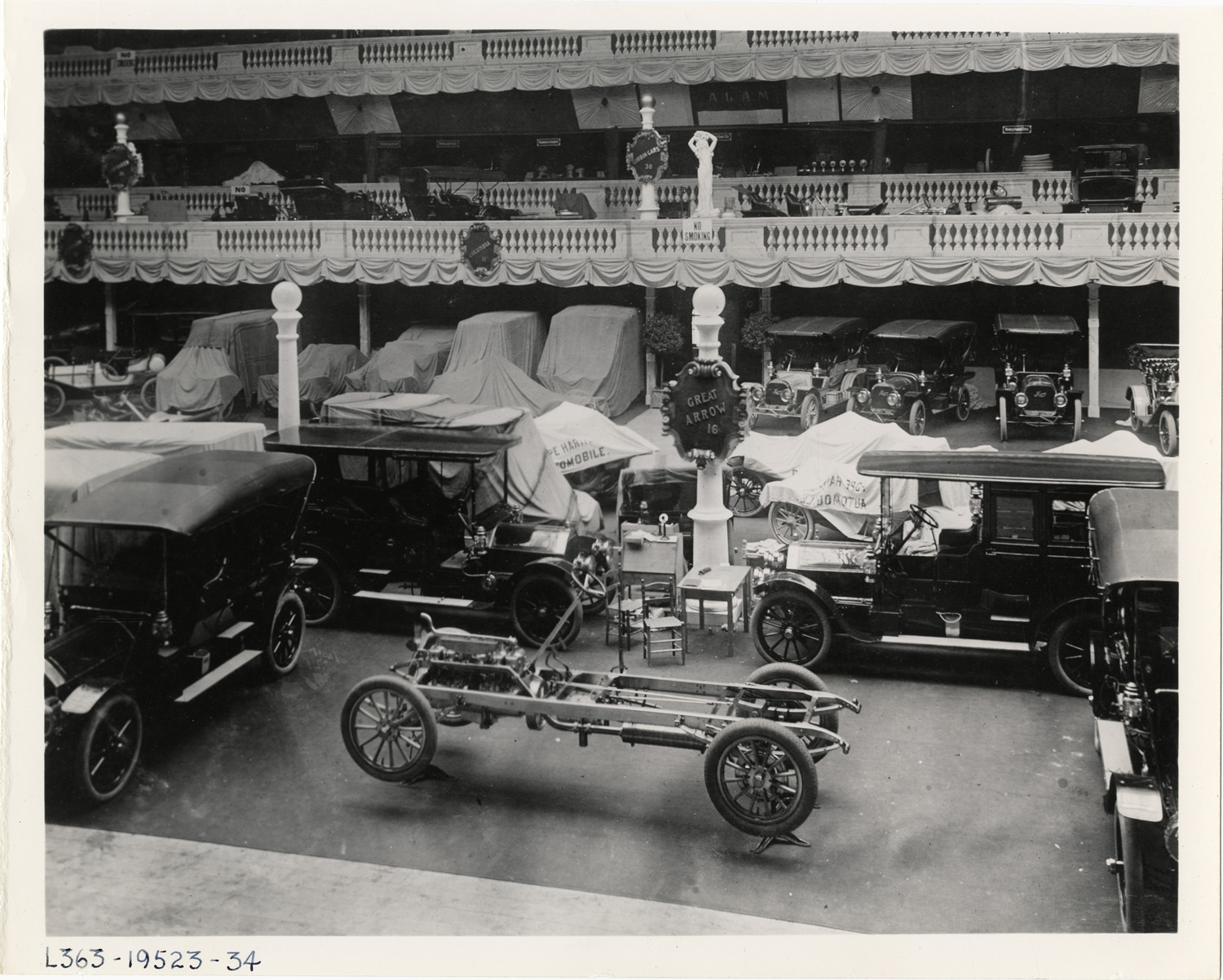 Favorite this☆ Great Arrow automobiles on exhibit, 1908 New York Auto Show Description: View of Pierce Great Arrow cars and chassis on exhibit during the 1908 New York Auto Show held at Madison Square Garden. Handwritten on back: "Shows--New York, 1908." Details Resource ID: na017615 Subject: Pierce-Arrow automobile Automobiles--Chassis Trade shows--New York (State)--New York Photographic prints Date Issued: 1908 Format: 1 photographic print ; 8 x 10 in. Member of: National Automotive History Collection Lazarnick Collection Filing Location: Shows--New York, 1903-1905, 1907-1908 Rights: Physical rights are retained by DPL. Copyright is retained in accordance with U.S. copyright laws.