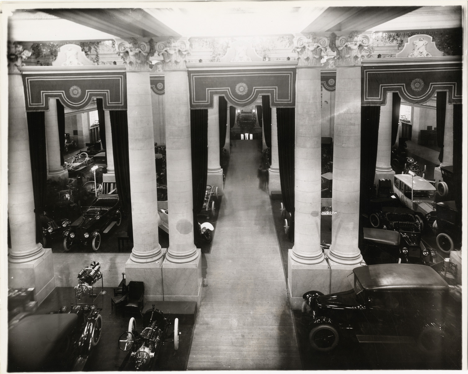 View of Overland cars on exhibit during the 1916 New York Auto Show held at the Grand Central Palace. Aisle is framed with columns. Stamped on back: "Photographic illustration by Nick Lazarnick, 230 Park Ave., N.Y." Handwritten on back: "Shows--New York, 1916."
