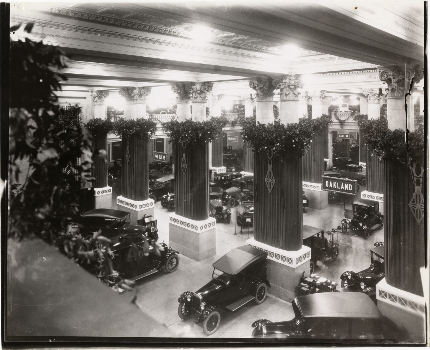 View of cars on exhibit during the 1922 New York Auto Show held at the Grand Central Palace. Columns are decorated with drapery and greenery. Stamped on back: "Photographic illustration by Nick Lazarnick, 230 Park Ave., N.Y." Handwritten on back: "Palace show. Shows--New York, 1922."