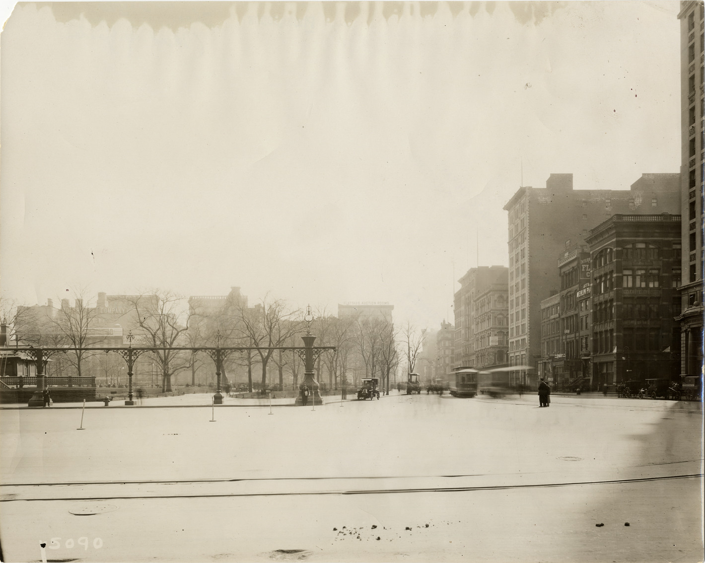 View of Madison Square Park, at the intersection of Broadway and 23rd Street, during the 1900 New York Auto Show held at Madison Square Garden in New York. Commercial buildings on right. Handwritten on back: "This looks like Madison Square, N.Y. (Broadway & 23 St. looking east), Old Madison Square Garden, site of auto show in early 1900 would be off to the left of this view. Shows--New York, 1900."