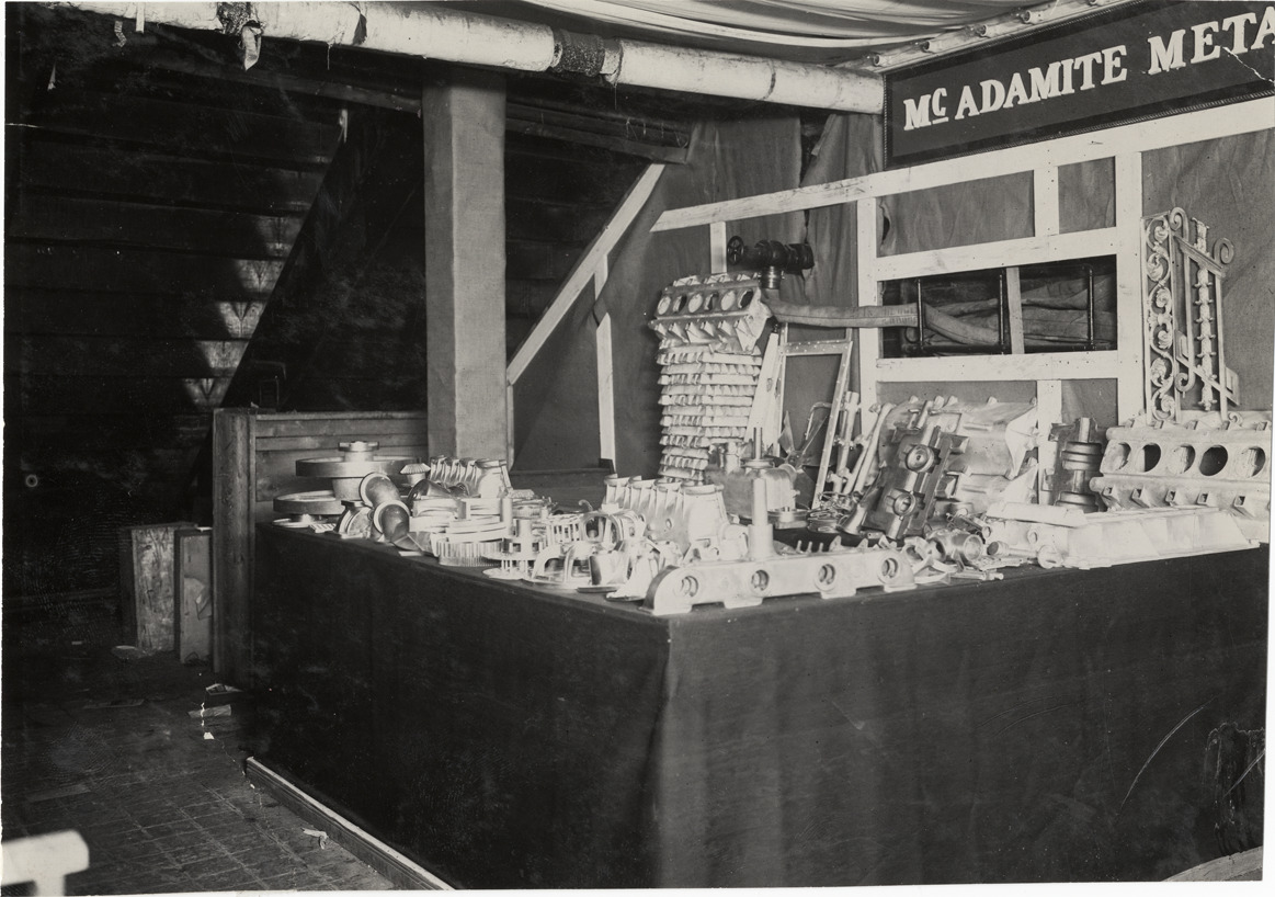View of McAdamite Metal Company exhibit of metal castings during the 1909 New York Auto Show held at Madison Square Garden. Stamped on back: "Spooner & Wells, Inc., photographers, telephones 3472-3473 Columbus, 1931 Broadway, New York." Handwritten on back: "Shows--New York Auto Show (Madison Square Garden exhibit), 1909."
