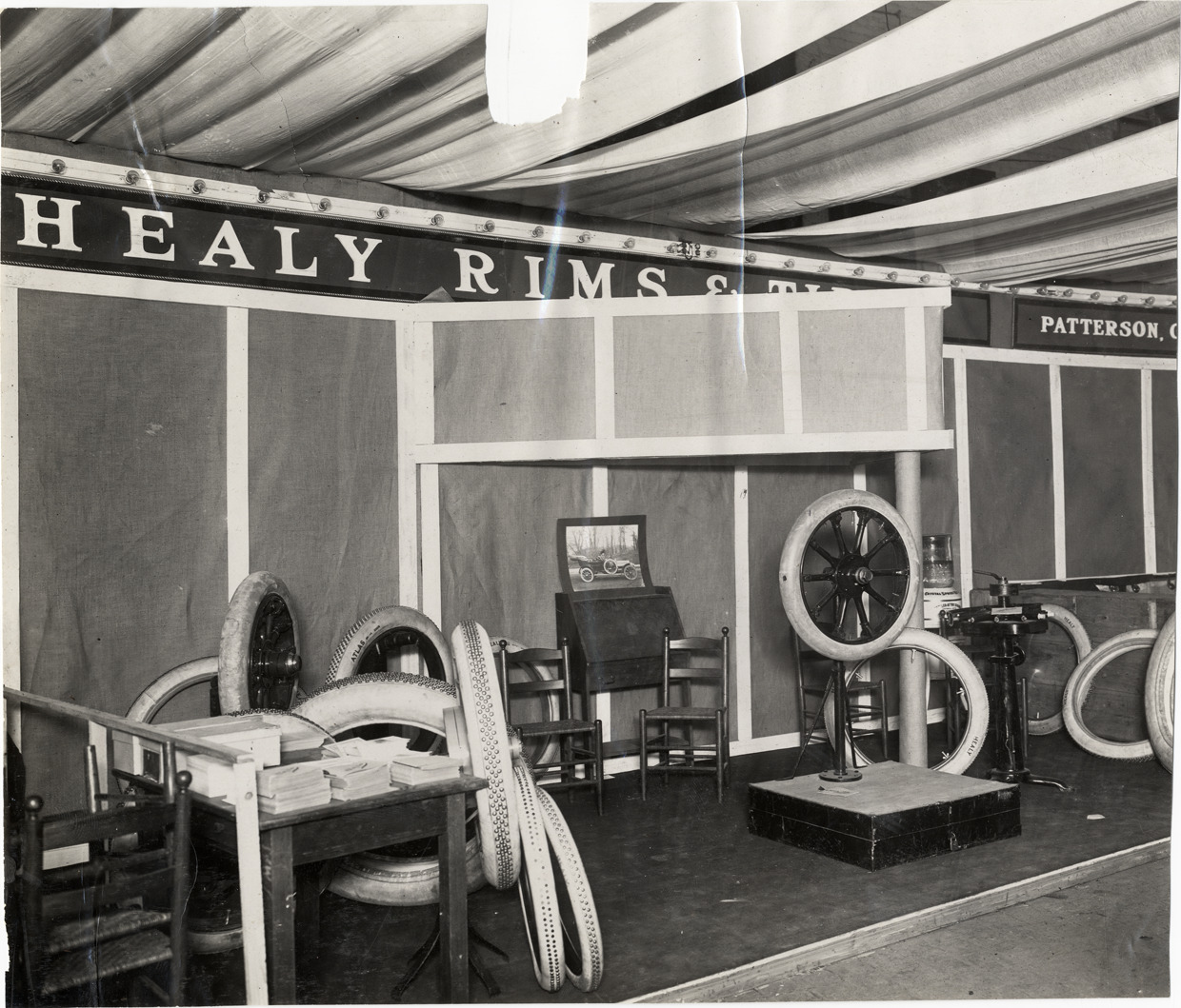 View of Healy Leather Tire Company exhibit of tires and rims during the 1909 New York Auto Show held at Madison Square Garden. "Healy rims & tires" sign in background. Stamped on back: "Spooner & Wells, Inc., photographers, telephones 3472-3473 Columbus, 1931 Broadway, New York." Handwritten on back: "Shows--New York Auto Show (Madison Square Garden exhibit), 1909."
