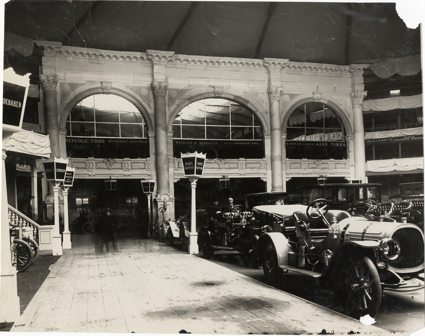 View of Pope-Hartford cars on exhibit during the 1909 New York Auto Show held at Madison Square Garden. Arched colonnade in background. Handwritten on back: "Shows--New York Auto Show (Madison Square Garden exhibit), 1909."