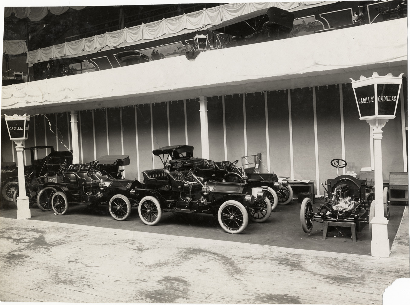 View of Cadillac cars and chassis on exhibit during the 1909 New York Auto Show held at Madison Square Garden. Stamped on back: "Spooner & Wells, Inc., photographers, telephones 3472-3473 Columbus, 1931 Broadway, New York." Handwritten on back: "Shows--New York Auto Show (Madison Square Garden exhibit), 1909."