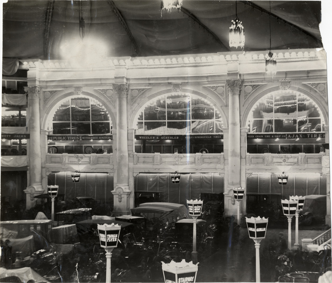 Nighttime view of cars on exhibit during the 1909 New York Auto Show held at Madison Square Garden. Arched colonnade and lampposts are illuminated with electric lights. Stamped on back: "Spooner & Wells, Inc., photographers, telephones 3472-3473 Columbus, 1931 Broadway, New York" and "Spooner and Wells, 1931 Broadway, New York, duplicates any time, enlargements all sizes, tel. 3472-3473 Col., credit appreciated." Handwritten on back: "Shows--New York Auto Show (Madison Square Garden exhibit), 1909."