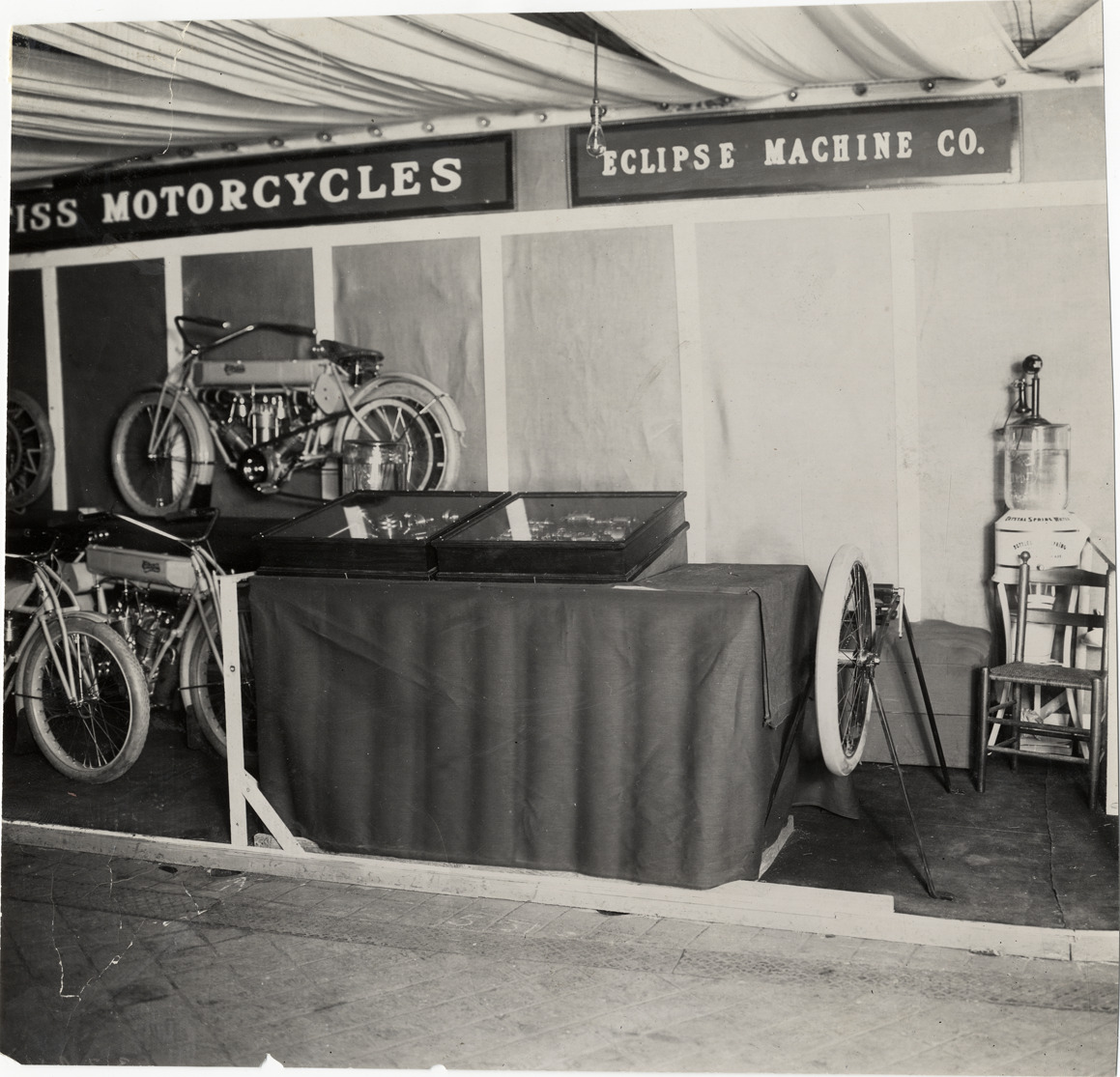 View of Curtiss motorcycles on exhibit during the 1909 New York Auto Show held at Madison Square Garden. "[Curt]iss motorcycles" and "Eclipse Machine Co." signs in background. Stamped on back: "Spooner & Wells, Inc., photographers, telephones 3472-3473 Columbus, 1931 Broadway, New York." Handwritten on back: "Shows--New York Auto Show (Madison Square Garden exhibit), 1909."