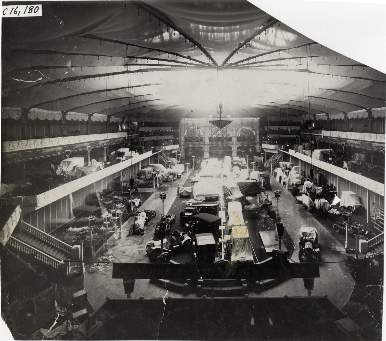 View of cars covered with tarpaulins during installation of the 1909 New York Auto Show held at Madison Square Garden. Stamped on back: "Spooner & Wells, Inc., photographers, telephones 3472-3473 Columbus, 1931 Broadway, New York." Handwritten on back: "Afternoon before opening. Shows--New York Auto Show (Madison Square Garden exhibit), 1909."