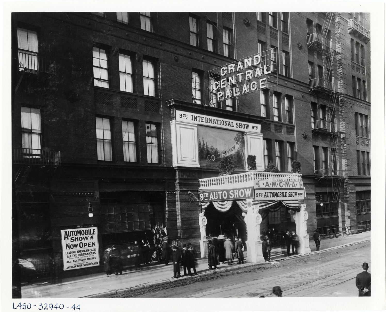 View of men and women standing in front of entrance to Grand Central Palace for the 1909 New York Auto Show. Entrance is decorated with mural, bunting and statuary; "Grand Central Palace" electric sign on building. "9th International Show," "A.M.C.M.A.," "9th Automobile Show" and "Automobile show now open, leading American cars, all the foreign cars, direct from the Paris salon, all accessory makers, management of American Motor Car Manufa'rs Ass'n." signs at entrance. Handwritten on back: "Shows--New York Auto Show (Grand Central Palace exhibit), 1909."