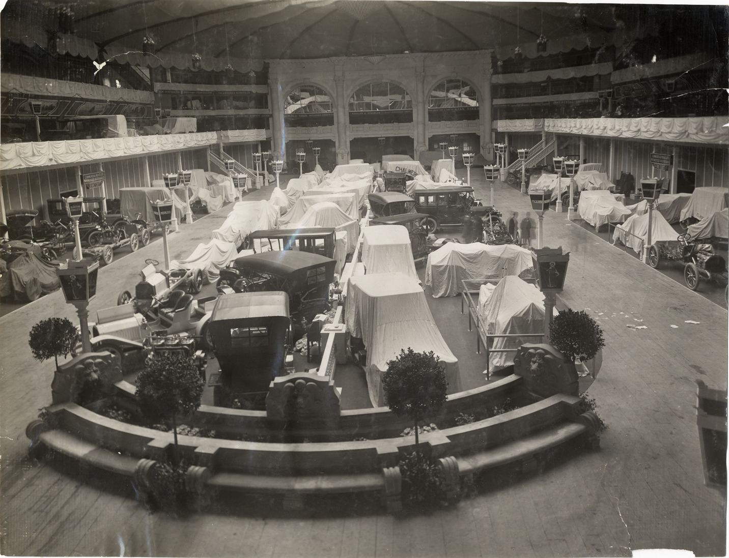View of cars, some covered with tarpaulins, on exhibit during the 1909 New York Auto Show held at Madison Square Garden. Stamped on back: "Spooner & Wells, Inc., photographers, telephones 3472-3473 Columbus, 1931 Broadway, New York." Handwritten on back: "Sunday at the show. Shows--New York Auto Show (Madison Square Garden exhibit), 1909."