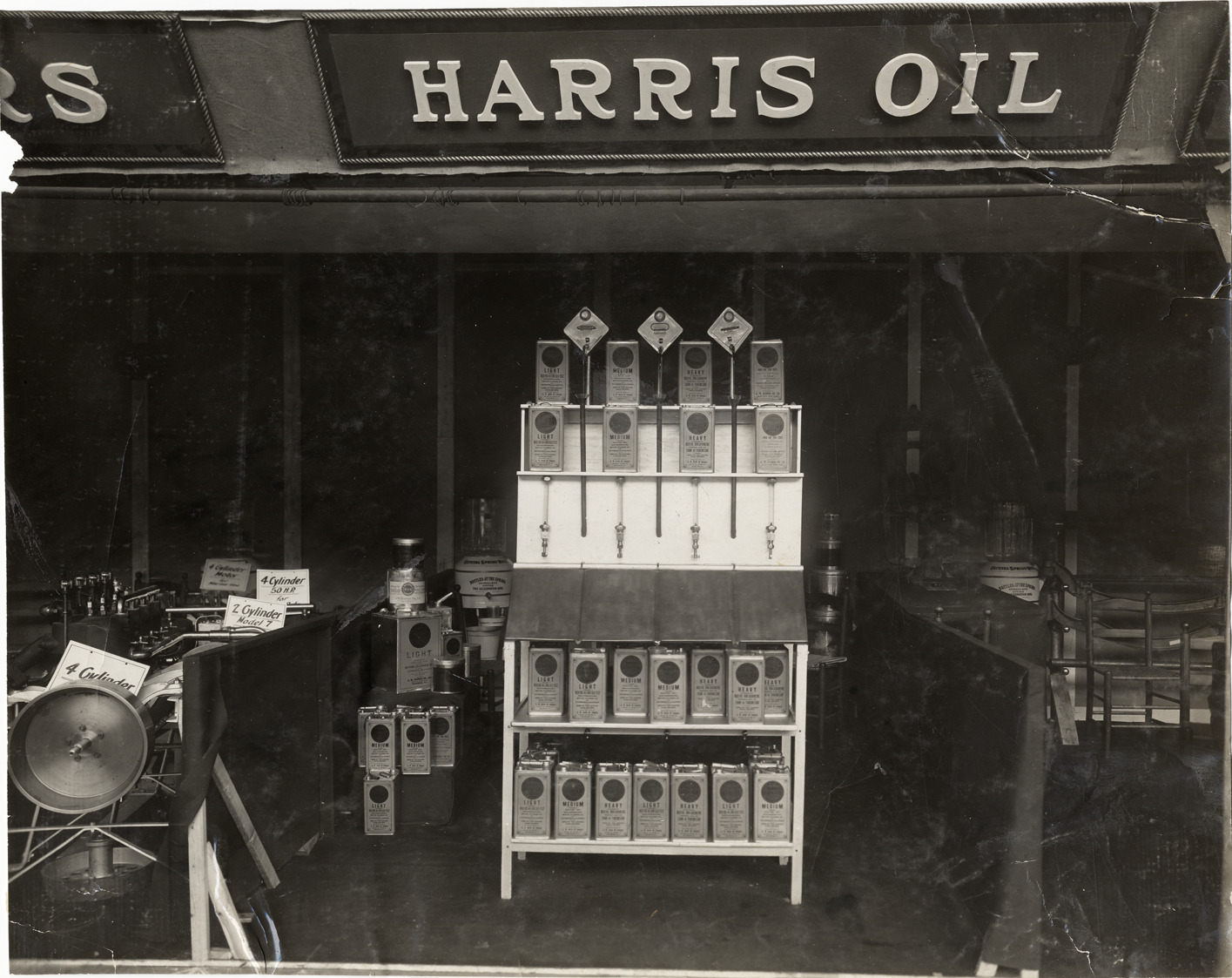 View of Harris oil exhibit during the 1909 New York Auto Show held at Madison Square Garden. Oil cans are displayed on rack; "Harris oil" sign overhead. Stamped on back: "Spooner & Wells, Inc., photographers, telephones 3472-3473 Columbus, 1931 Broadway, New York." Handwritten on back: "Shows--New York Auto Show (Madison Square Garden exhibit), 1909."