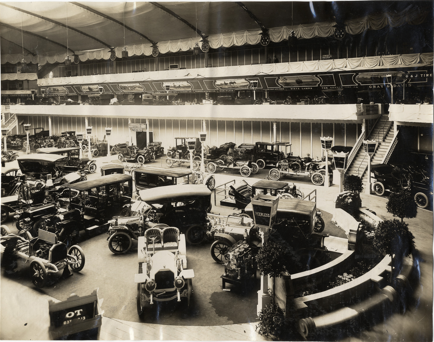 Bird's-eye view of Peerless cars on exhibit during the 1909 New York Auto Show held at Madison Square Garden. Handwritten on back: "Shows--New York Auto Show (Madison Square Garden exhibit), 1909."