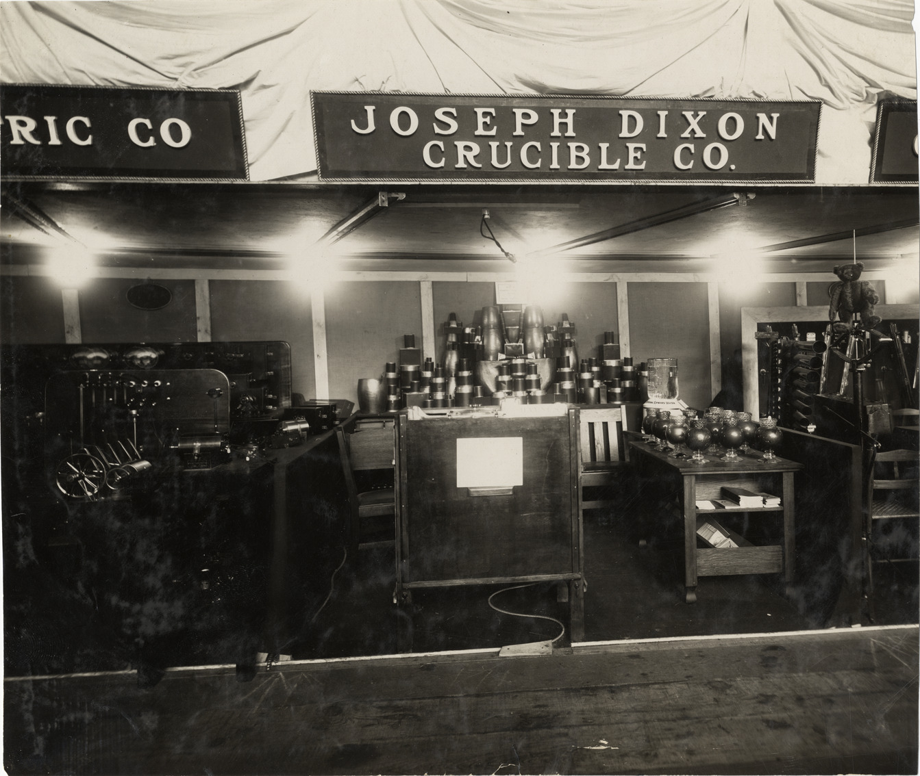 View of Joseph Dixon Crucible exhibit during the 1909 New York Auto Show held at Madison Square Garden. "Joseph Dixon Crucible Co." sign over exhibit. Stamped on back: "Spooner & Wells, Inc., photographers, telephones 3472-3473 Columbus, 1931 Broadway, New York." Handwritten on back: "Shows--New York Auto Show (Madison Square Garden exhibit), 1909."