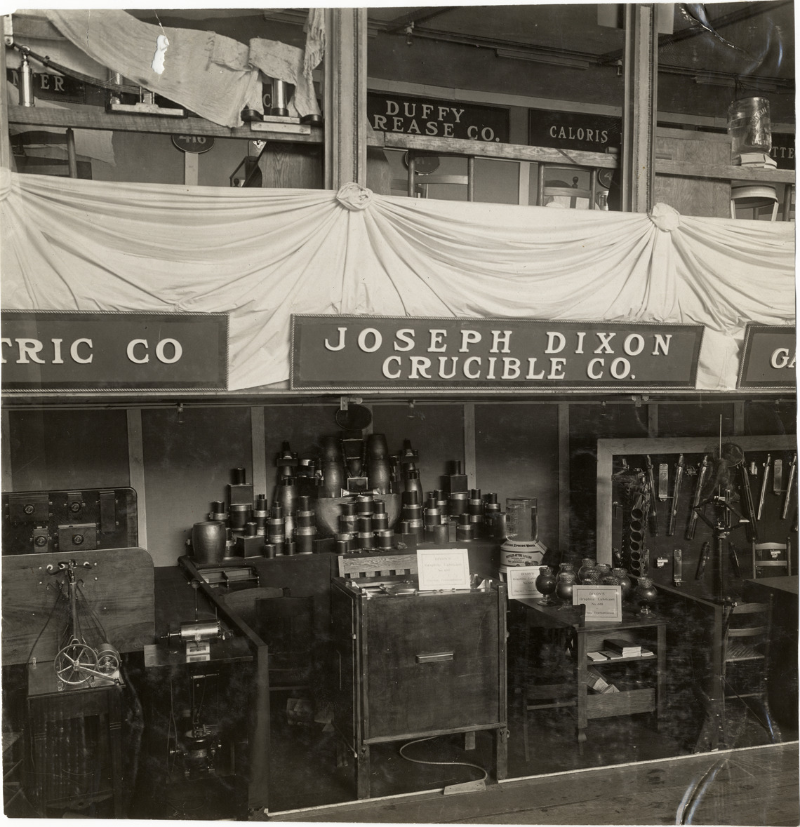 View of Joseph Dixon Crucible exhibit during the 1909 New York Auto Show held at Madison Square Garden. "Joseph Dixon Crucible Co." sign over exhibit. Stamped on back: "Spooner & Wells, Inc., photographers, telephones 3472-3473 Columbus, 1931 Broadway, New York." Handwritten on back: "Shows--New York Auto Show (Madison Square Garden exhibit), 1909."