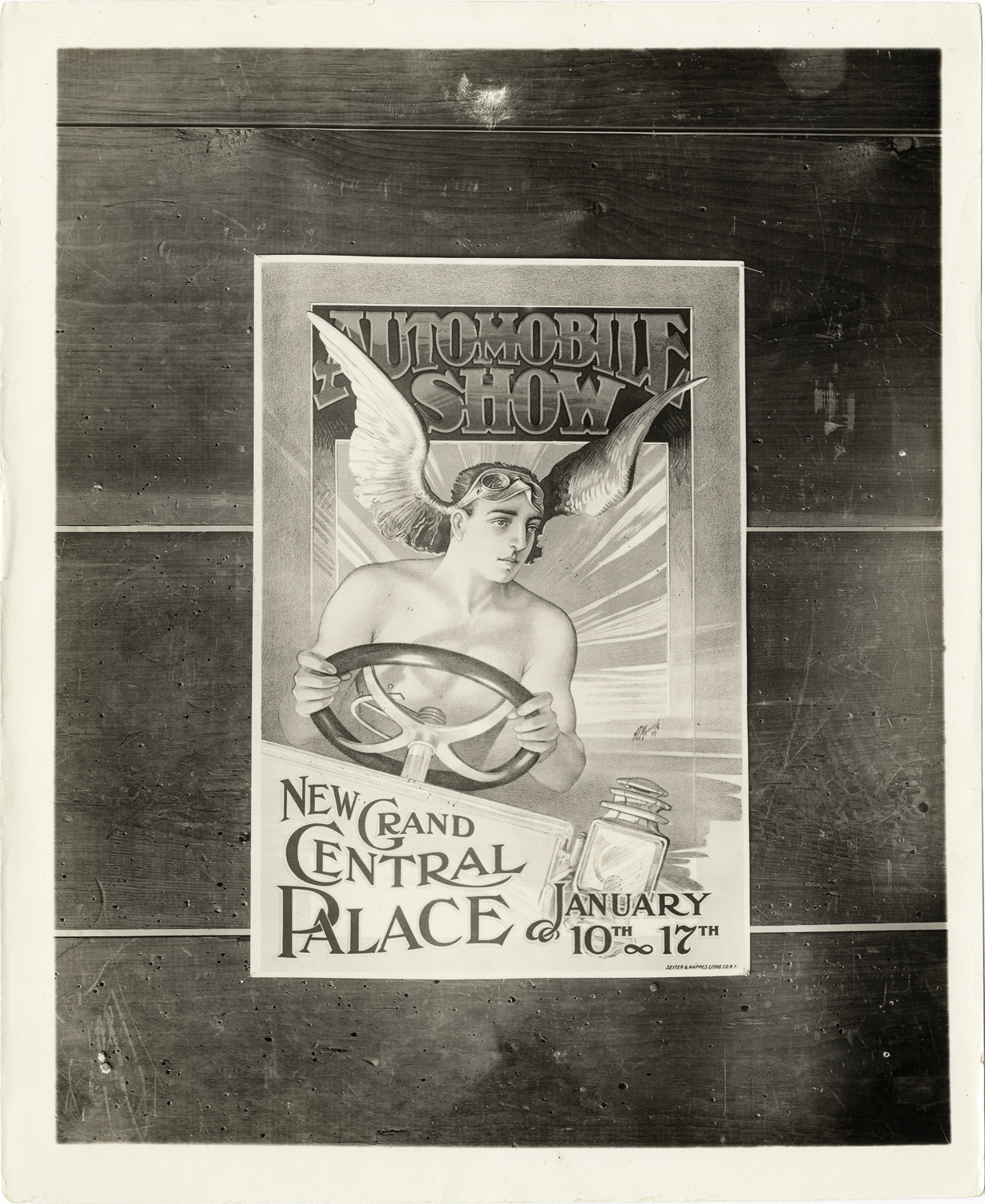 View of poster for the 1910 New York Auto Show held at the Grand Central Palace, depicting Mercury wearing goggles and winged helmet and driving an automobile. Printed on poster: "Automobile Show, New Grand Central Palace, January 10th - 17th." Stamped on back: "N. Lazarnick, commercial photographers, makers of industrial motion pictures, 246 W. 42d St., N.Y., Tel. Chickering 1717-18. 5005 Euclid Ave., Cleve., Randolph 7852." Handwritten on back: "Shows--New York Auto Show, 1910."