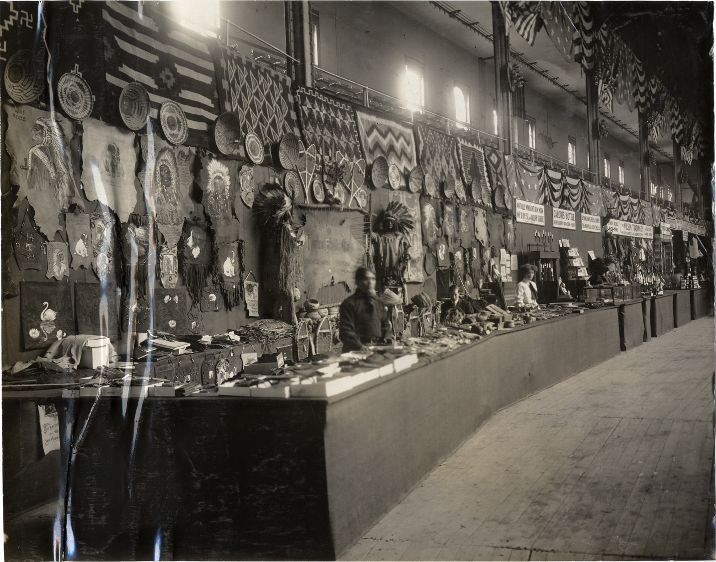 View of Indian Exhibits Company exhibit of Native American crafts during the 1909 Sportsman's Show held at Madison Square Garden in New York. "Indian Exhibits Co." sign in background. Handwritten on back: "Shows--New York Sportsman's Show, 1909."