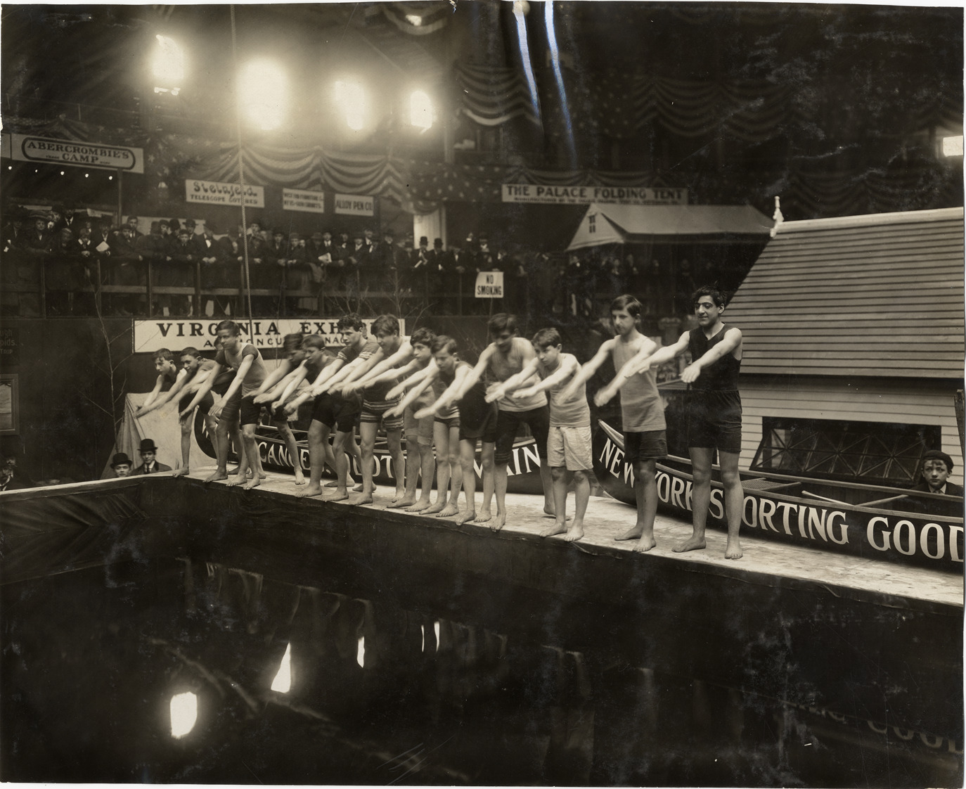 Swimmers preparing to dive into pool, 1909 Sportsman's Show