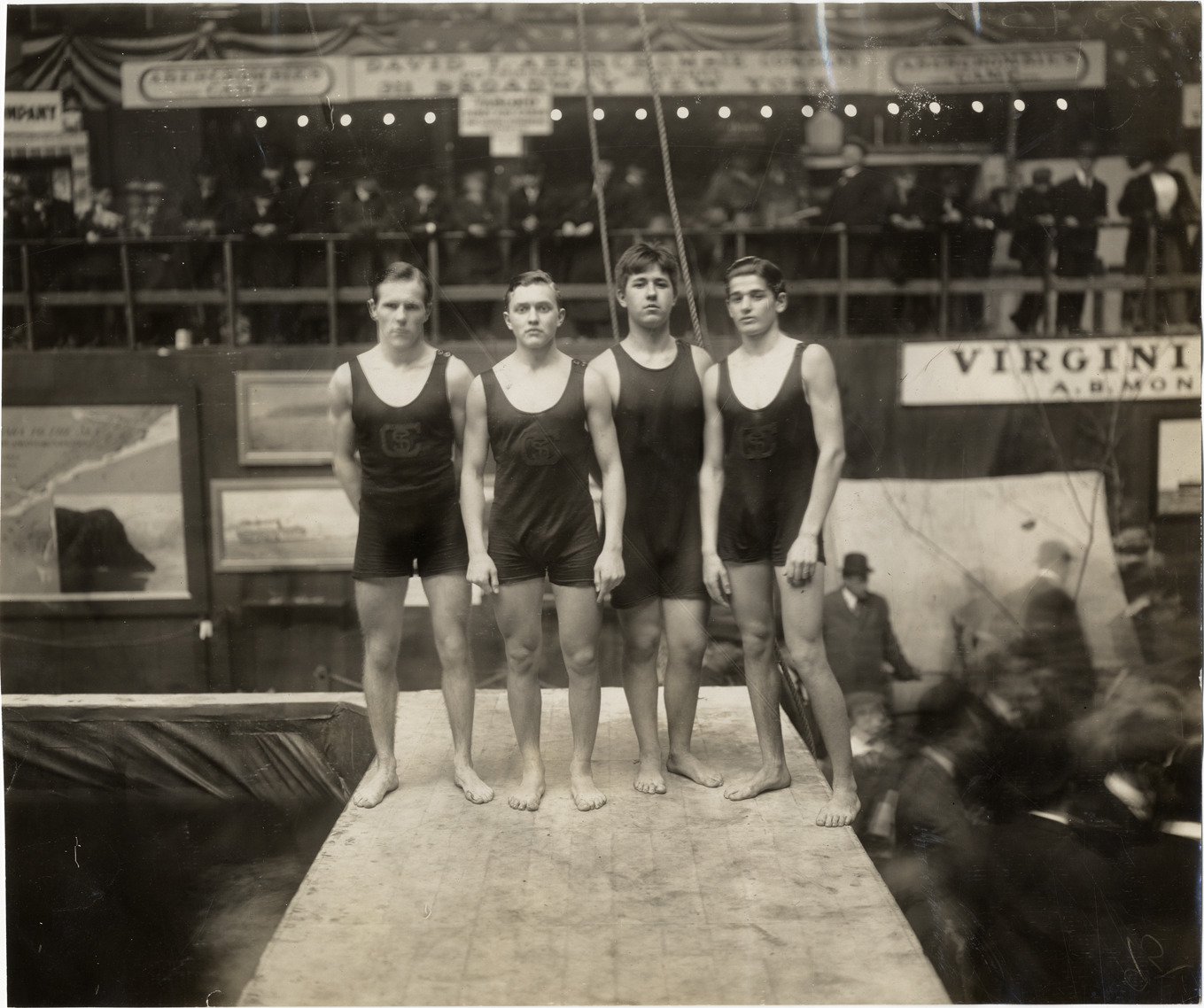 View of four swimmers from DeWitt Clinton High School during the 1909 Sportsman's Show held at Madison Square Garden in New York. Stamped on back: "Spooner and Wells, 1931 Broadway, New York, duplicates any time, enlargements all sizes, tel. 3472-3473 Col., credit appreciated." Handwritten on back: "DeWitt Clinton High School. Shows--New York Sportsman's Show, 1909."