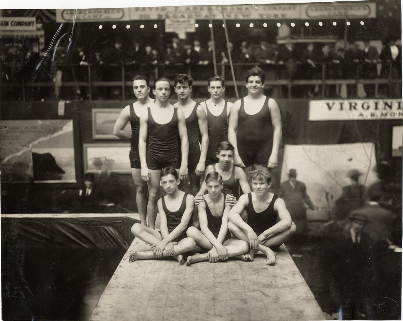 View of nine swimmers from Commerce High School posing at edge of pool during the 1909 Sportsman's Show held at Madison Square Garden in New York. Stamped on back: "Spooner and Wells, 1931 Broadway, New York, duplicates any time, enlargements all sizes, tel. 3472-3473 Col., credit appreciated." Handwritten on back: "Commerce High School. Shows--New York Sportsman's Show, 1909."