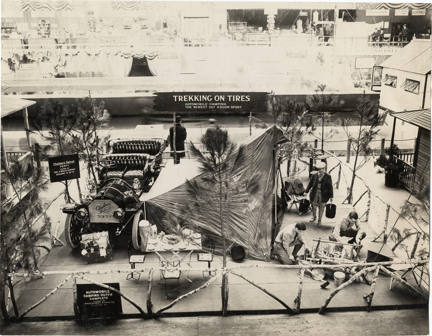 Bird's-eye view of automobile camping exhibit during the 1909 Sportsman's Show held at Madison Square Garden in New York. Exhibit includes a Chalmers-Detroit "Forty" car with tent. Two men cook over simulated campfire; camping table and chairs is set up in front of tent; man carries two pails of water. "Chalmers-Detroit Forty loaned by Carl H. Page & Company, Broadway at 50th St." sign displayed in front of car; "Automobile camping outfit loaned by Abercrombie & Fitch Co." displayed in front of exhibit; "Trekking on tires automobile camping the newest out o'door sport" sign displayed in background. Handwritten on back: "Shows--New York Sportsman's Show, 1909."