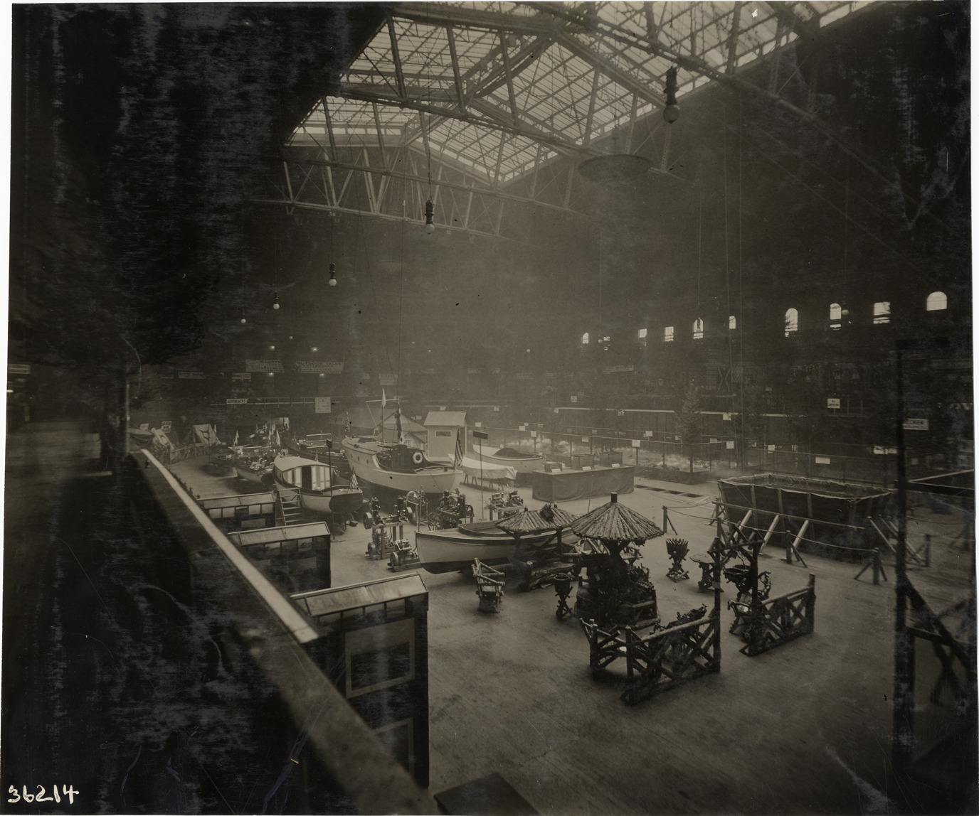 Bird's-eye view of exhibit area inside Madison Square Garden during the 1909 Sportsman's Show in New York. Stamped on back: "Spooner & Wells, Inc., photographers, telephones 3472-3473 Columbus, 1931 Broadway, New York." Handwritten on back: "Shows--New York Sportsman's Show, 1909."