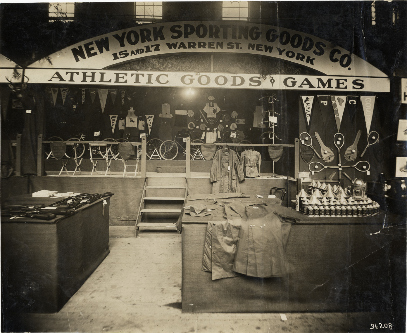View of New York Sporting Good Company exhibit during the 1909 Sportsman's Show held at Madison Square Garden in New York. Tennis rackets and balls, clothing and bicycles on display. "New York Sporting Goods Co., 15 and 17 Warren St., New York, athletic goods & games" sign in background. Stamped on back: "Spooner & Wells, Inc., photographers, telephones 3472-3473 Columbus, 1931 Broadway, New York." Handwritten on back: "Shows--New York Sportsman's Show, 1909."