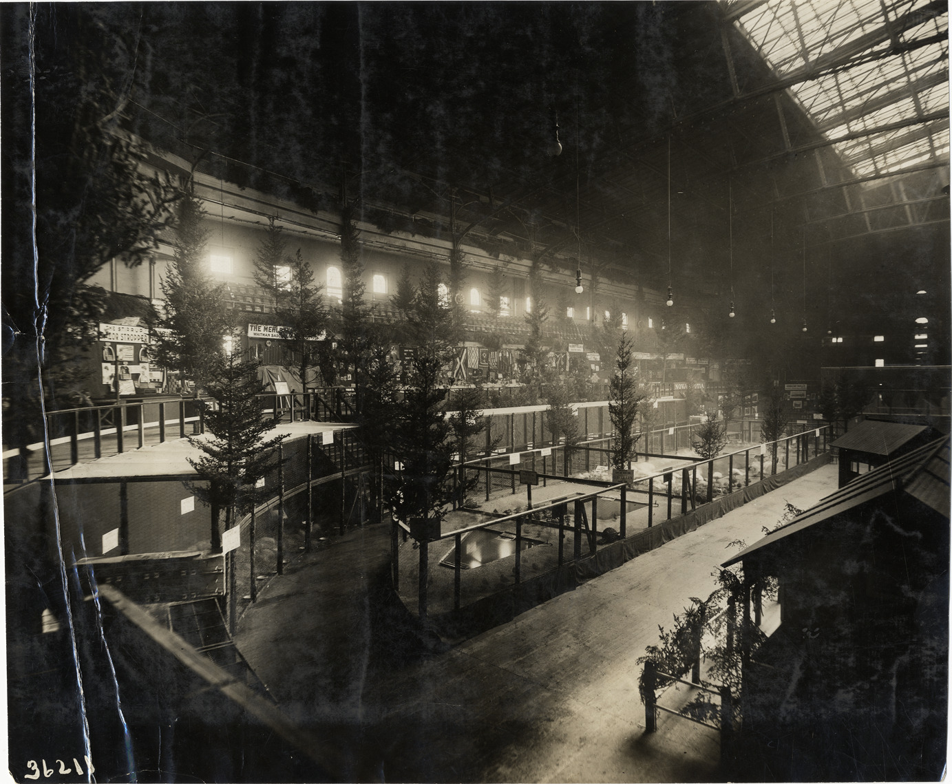 View of ducks, geese and other waterfowl around ponds in fenced enclosures during the 1909 Sportsman's Show held at Madison Square Garden in New York. Area is decorated with artificial pine trees. Stamped on back: "Spooner & Wells, Inc., photographers, telephones 3472-3473 Columbus, 1931 Broadway, New York." Handwritten on back: "Shows--New York Sportsman's Show, 1909."