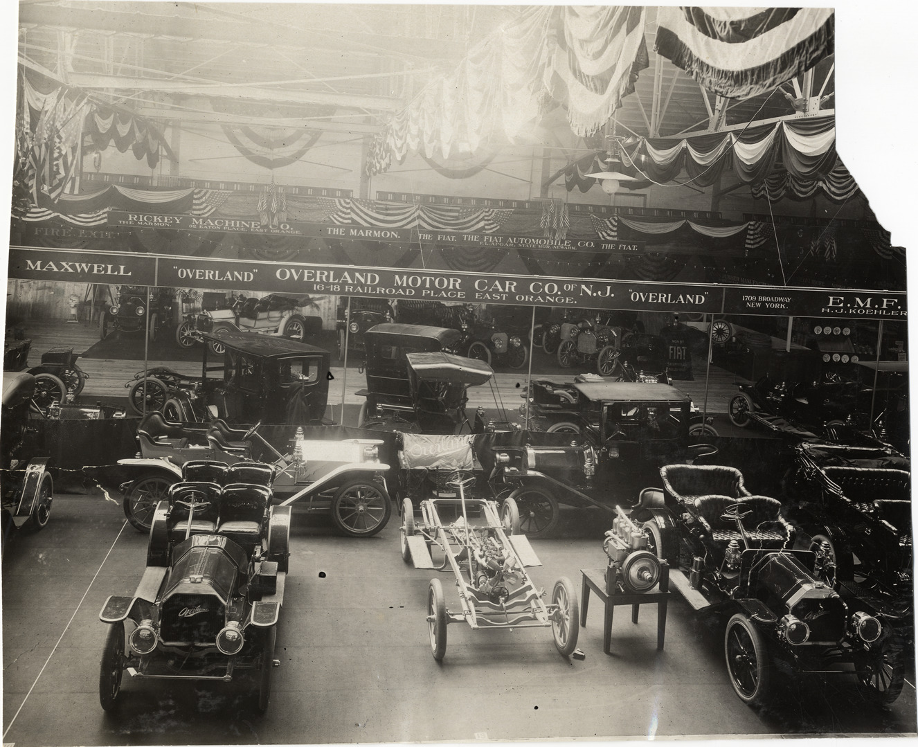 View of Overland cars on exhibit during the 1909 Auto Show held at the Essex Troop Armory in Newark, New Jersey. "Overland, Overland Motor Car Co. of N.J., 16-18 Railroad Place, East Orange" sign in background. Stamped on back: "Spooner & Wells, Inc., photographers, telephones 3472-3473 Columbus, 1931 Broadway, New York." Handwritten on back: "Shows--Newark Auto Show, 1909."