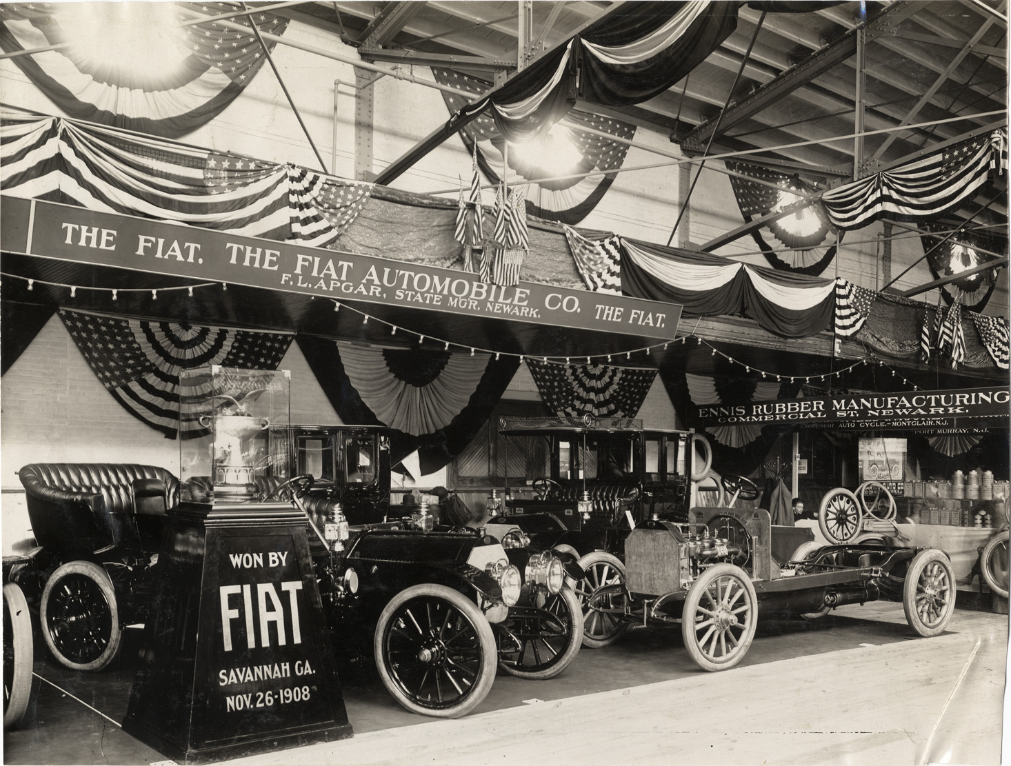 View of Fiat cars on exhibit during the 1909 Auto Show held at the Essex Troop Armory in Newark, New Jersey. Trophy cup on pedestal with sign reading: "Won by Fiat, Savannah, Ga., Nov. 26, 1908." "The Fiat Automobile Co., the Fiat, F.L. Apgar, state mg'r., Newark" sign in background. Stamped on back: "Spooner and Wells, 1931 Broadway, New York, duplicates any time, enlargements all sizes, tel. 3472-3473 Col., credit appreciated." Handwritten on back: "Shows--Newark Auto Show, 1909."