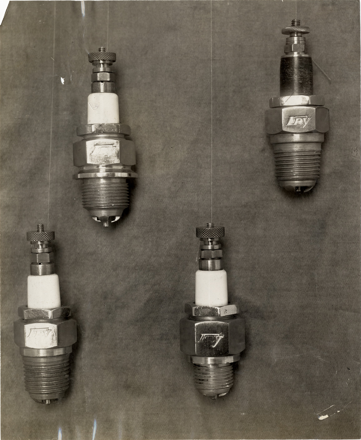 Close-up view of Fry spark plugs during the 1909 Auto Show held at the Essex Troop Armory in Newark, New Jersey. Stamped on back: "Spooner & Wells, Inc., photographers, telephones 3472-3473 Columbus, 1931 Broadway, New York." Handwritten on back: "Shows--Newark Auto Show, 1909."
