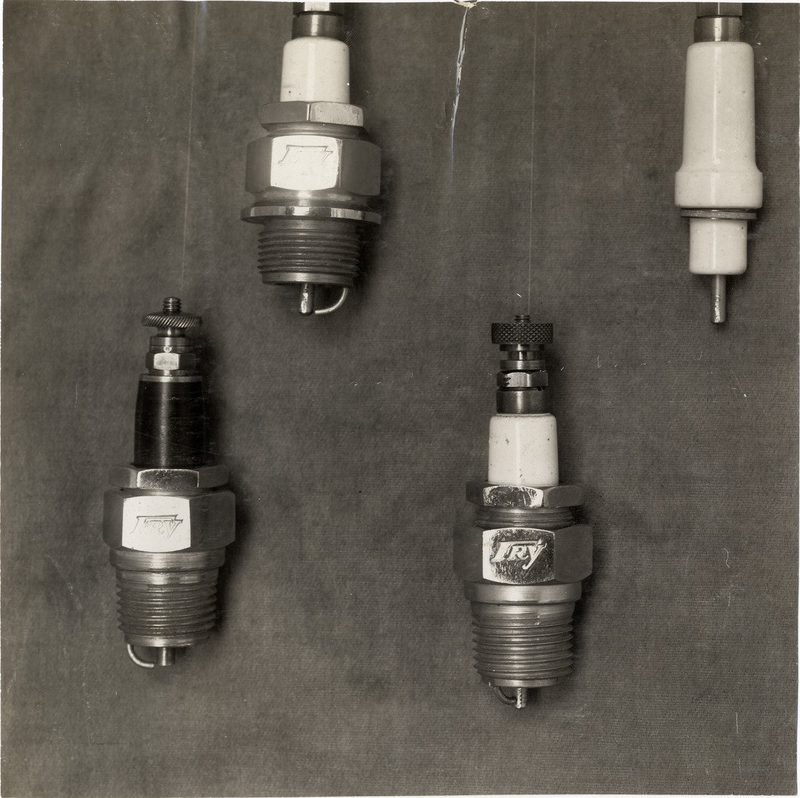 Close-up view of Fry spark plugs during the 1909 Auto Show held at the Essex Troop Armory in Newark, New Jersey. Stamped on back: "Spooner & Wells, Inc., photographers, telephones 3472-3473 Columbus, 1931 Broadway, New York." Handwritten on back: "Shows--Newark Auto Show, 1909."