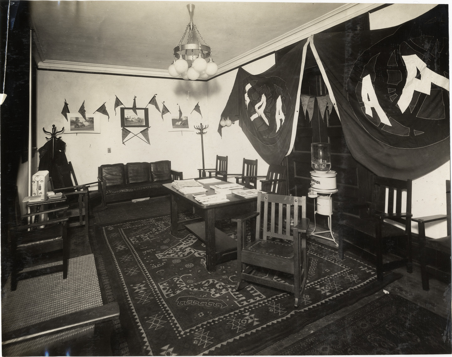 View of American Automobile Association headquarters during the 1909 Auto Show held at the Essex Troop Armory in Newark, New Jersey. Area is furnished with sofa, table, chairs and Oriental rug; "AAA" banners displayed on wall. Water cooler in background. Stamped on back: "Spooner and Wells, 1931 Broadway, New York, duplicates any time, enlargements all sizes, tel. 3472-3473 Col., credit appreciated." Handwritten on back: "AAA hq's, '09 Newark. Shows--Newark Auto Show, 1909."