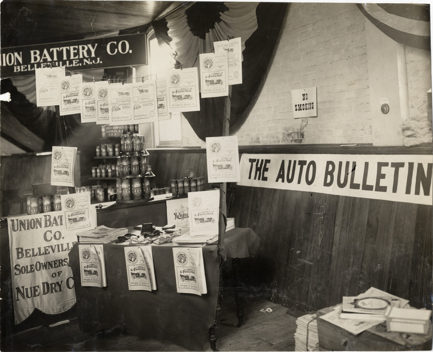 View of Auto Bulletin exhibit during the 1909 Auto Show held at the Essex Troop Armory in Newark, New Jersey. Area is decorated with pages from the Auto Bulletin magazine; Union Battery Company exhibit in background. Handwritten on back: "Shows--Newark Auto Show, 1909."
