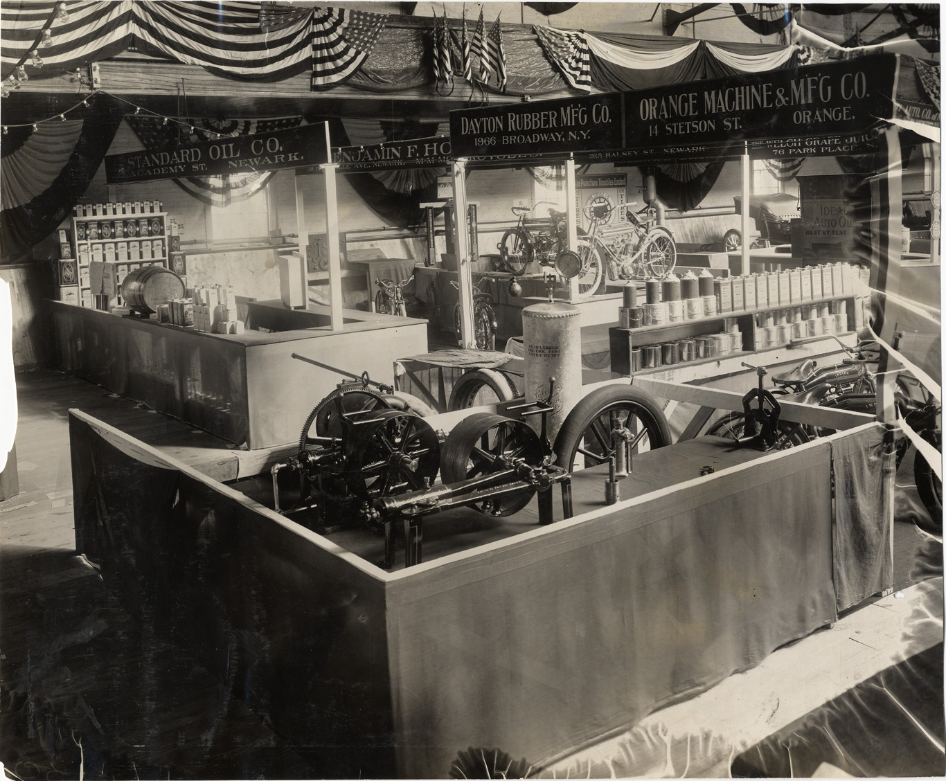 View of Orange Machine & Manufacturing Company exhibit during the 1909 Auto Show held at the Essex Troop Armory in Newark, New Jersey. Dayton Rubber Manufacturing Company and Standard Oil Company exhibits in background. Stamped on back: "Spooner and Wells, 1931 Broadway, New York, duplicates any time, enlargements all sizes, tel. 3472-3473 Col., credit appreciated." Handwritten on back: "Shows--Newark Auto Show, 1909."