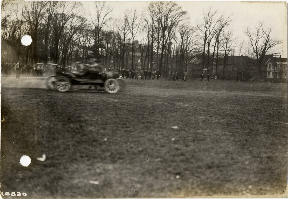 Driver and passenger in automobile participating in auto polo game, Clark Park