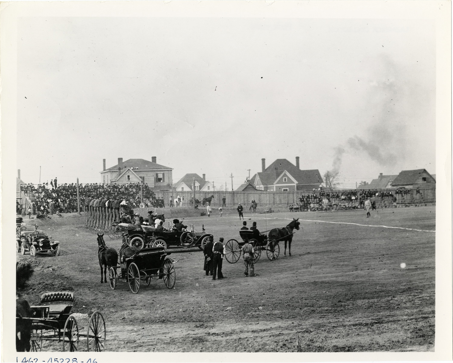 View of spectators, some with cars and horse-drawn carriages, watching a New York Yankees baseball game. Bleachers and wooden fence in background. Handwritten on back: "New York Yankees. Sporting events--Baseball, 1910."