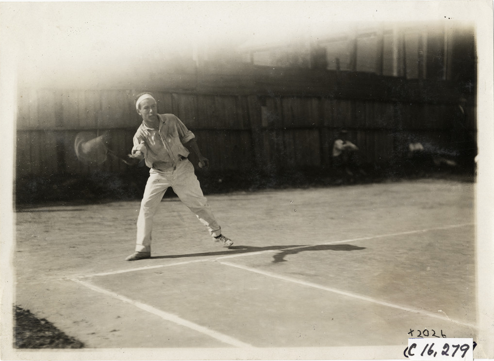 View of tennis player swinging a tennis racket on court. Stamped on back: "Spooner & Wells, Inc., photographers, telephone North 1745. 1231 Woodward Ave., Detroit, Mich. Detroit, 1231 Woodward, New York, 1931 Broadway." Handwritten on back: "Sporting events--Tennis, 1910."