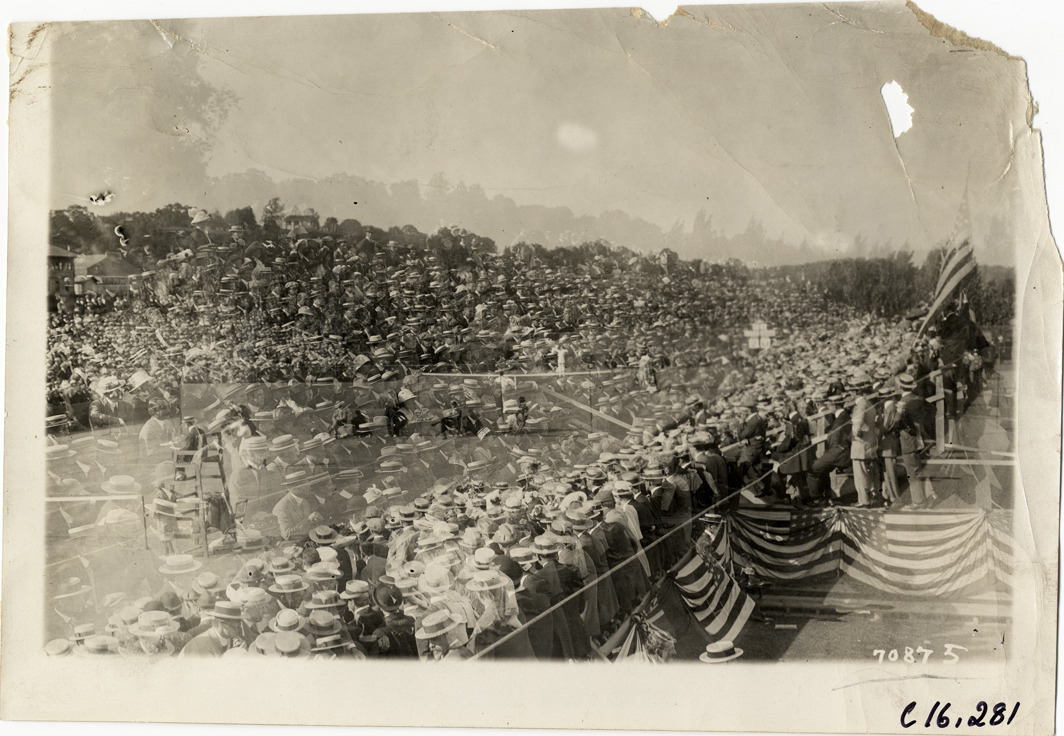 View of crowd of spectators in grandstand during tennis match. Stamped on back: "Spooner & Wells, Inc., photographers, telephones 3472-3473 Columbus, 1931 Broadway, New York." Handwritten on back: "Sporting events--Tennis, 1911."