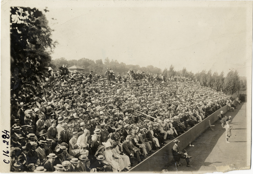 Favorite this☆ Spectators in grandstand during tennis match Description: View of crowd of spectators in grandstand during tennis match. Stamped on back: "Spooner & Wells, Inc., photographers, telephones 3472-3473 Columbus, 1931 Broadway, New York." Handwritten on back: "Sporting events--Tennis, 1911." Details Resource ID: na017974 Creator: Spooner & Wells Subject: Sports spectators Tennis--Tournaments Photographers--New York (State)--New York Photographic prints Date Issued: 1911 Format: 1 photographic print ; 4.75 x 6.75 in. Member of: National Automotive History Collection Lazarnick Collection Filing Location: Sporting events--Tennis, 1911 Negative Number: Negative #C16,284 Rights: Physical rights are retained by DPL. Copyright is retained in accordance with U.S. copyright laws.