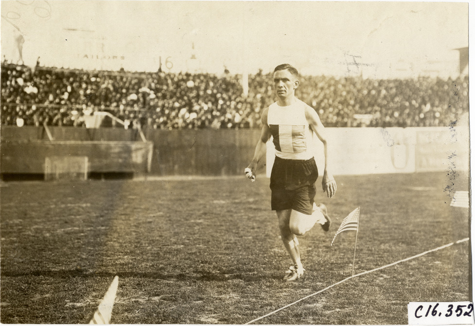 View of runner competing in race at track meet. Spectators in grandstand. Stamped on back: "Spooner & Wells, Inc., photographers, telephones 3472-3473 Columbus, 1931 Broadway, New York." Handwritten on back: "Sporting events--Track and field, 1909."