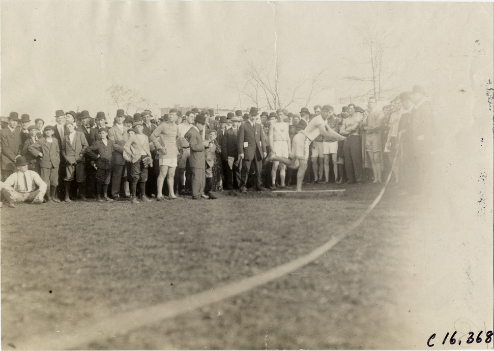 View of man throwing shot put during track and field competition. Athletes, spectators and officials in background. Stamped on back: "Spooner & Wells, Inc., photographers, telephones 3472-3473 Columbus, 1931 Broadway, New York." Handwritten on back: "Sporting events--Track and field, 1909."