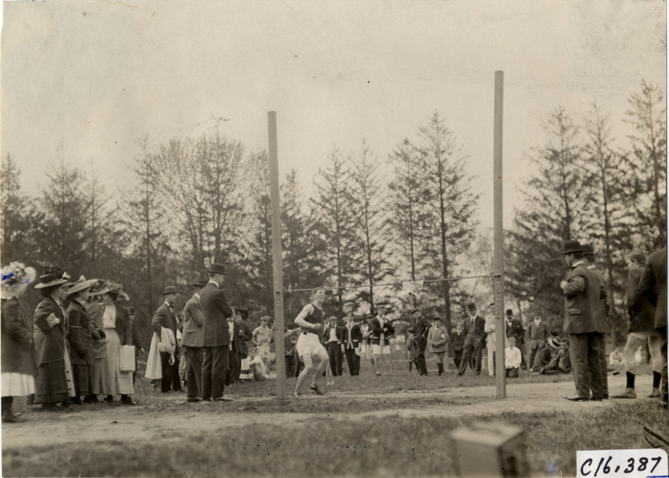 View of athlete competing in high jump at track meet. Spectators and officials watch from sidelines. Stamped on back: "Spooner & Wells, Inc., photographers, telephones 3472-3473 Columbus, 1931 Broadway, New York." Handwritten on back: "Sporting events--Track and field, 1909."
