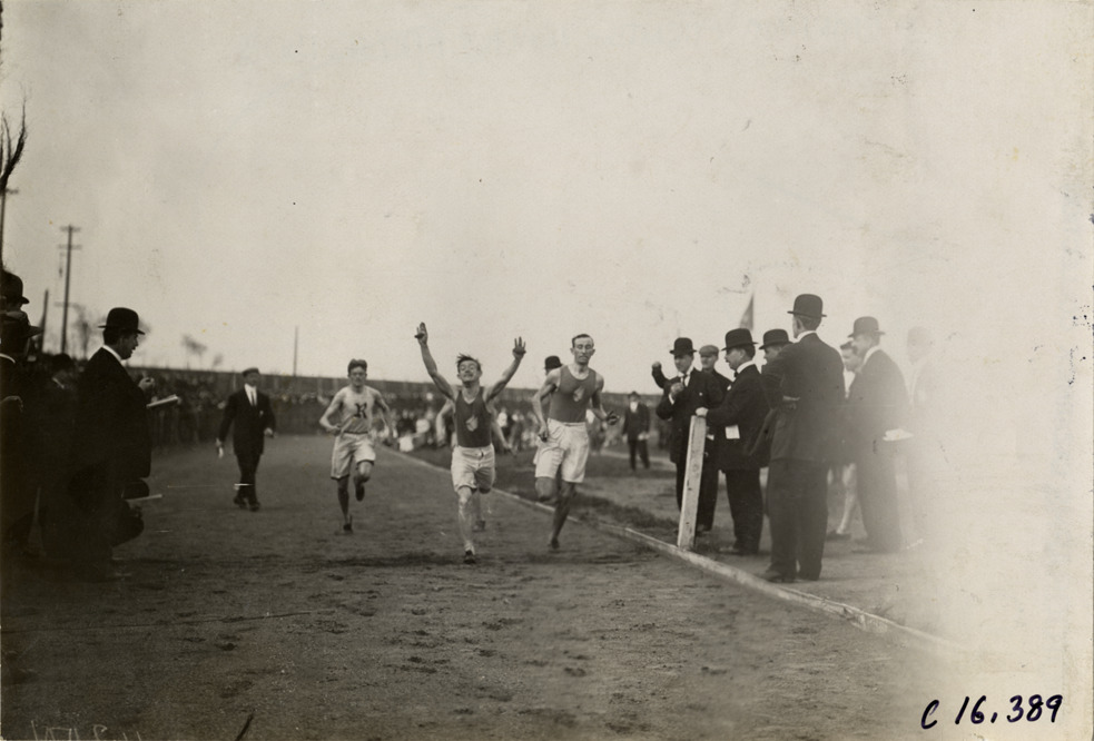 Favorite this☆ Runners crossing finish line Description: View of runners crossing finish line during race at track meet. Winning runner holds arms outstretched; officials in foreground. Handwritten on back: "Sporting events--Track and field, 1909." Details Resource ID: na018048 Subject: Runners (Sports) Running races Sports officials Photographic prints Date Issued: 1909 Format: 1 photographic print ; 4.5 x 6.75 in. Member of: National Automotive History Collection Lazarnick Collection Filing Location: Sporting events--Track and field, 1909 #3 Negative Number: Negative #C16,389 Rights: Physical rights are retained by DPL. Copyright is retained in accordance with U.S. copyright laws.