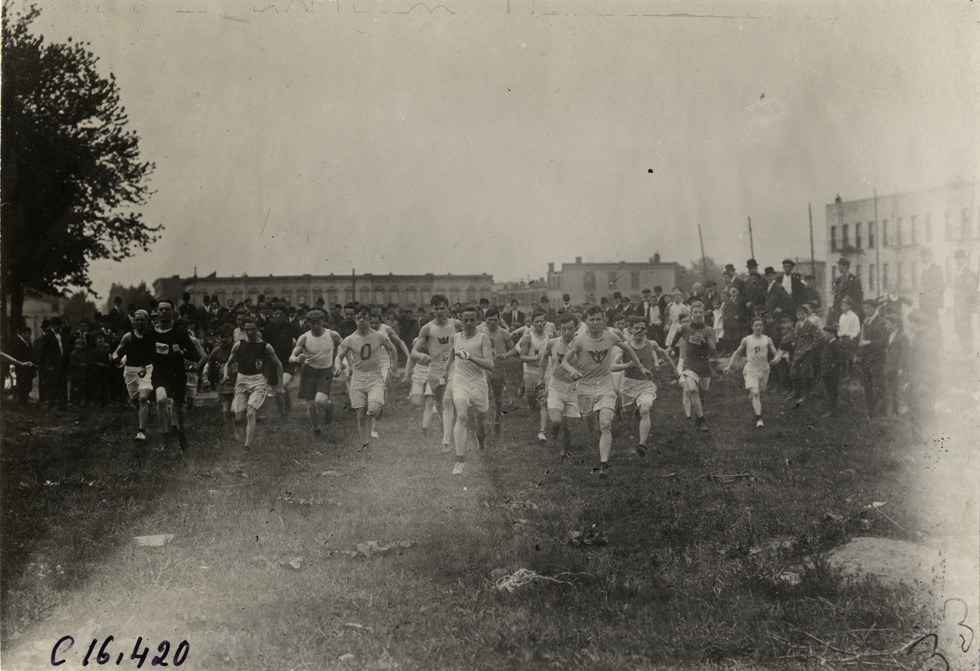Favorite this☆ Athletes running in field Description: View of runners racing through field at track meet. Spectators and brick buildings in background. Handwritten on back: "Sporting events--Track and field, 1909." Details Resource ID: na018079 Subject: Runners (Sports) Running races Track and field--Tournaments Photographic prints Date Issued: 1909 Format: 1 photographic print ; 4.5 x 6.75 in. Member of: National Automotive History Collection Lazarnick Collection Filing Location: Sporting events--Track and field, 1909 #4 Negative Number: C16,420 Rights: Physical rights are retained by DPL. Copyright is retained in accordance with U.S. copyright laws.