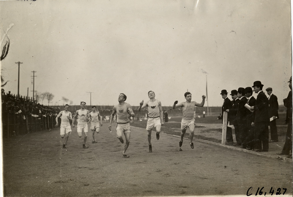 View of runners crossing finish line during race at track meet. Officials and spectators watch from sidelines. Handwritten on back: "Sporting events--Track and field, 1909."